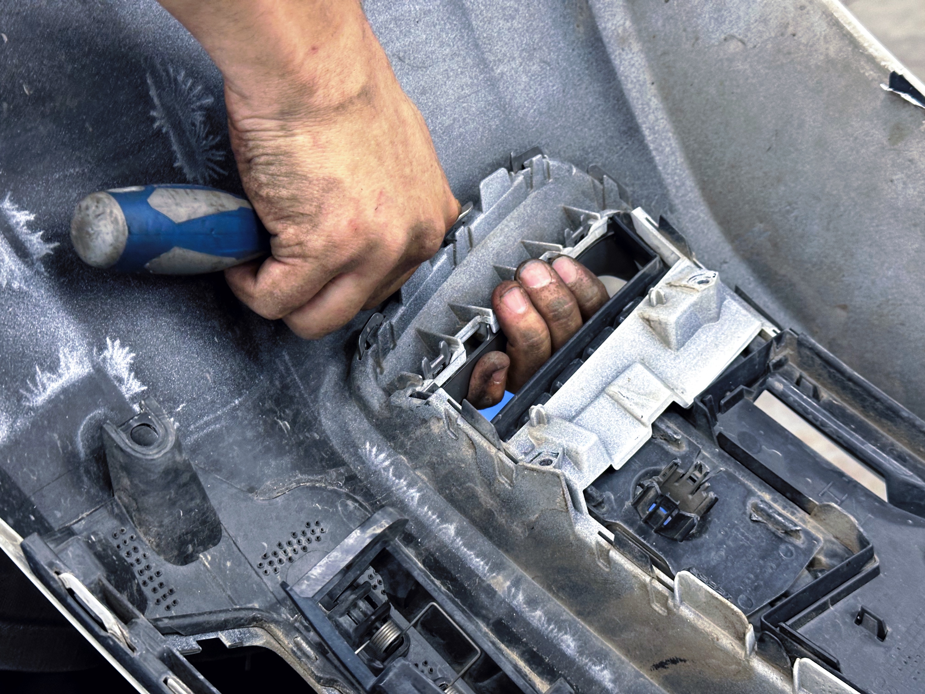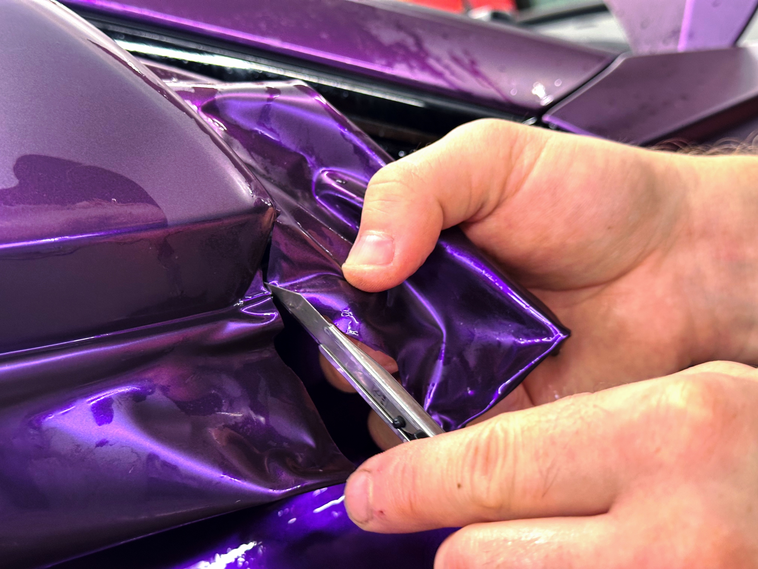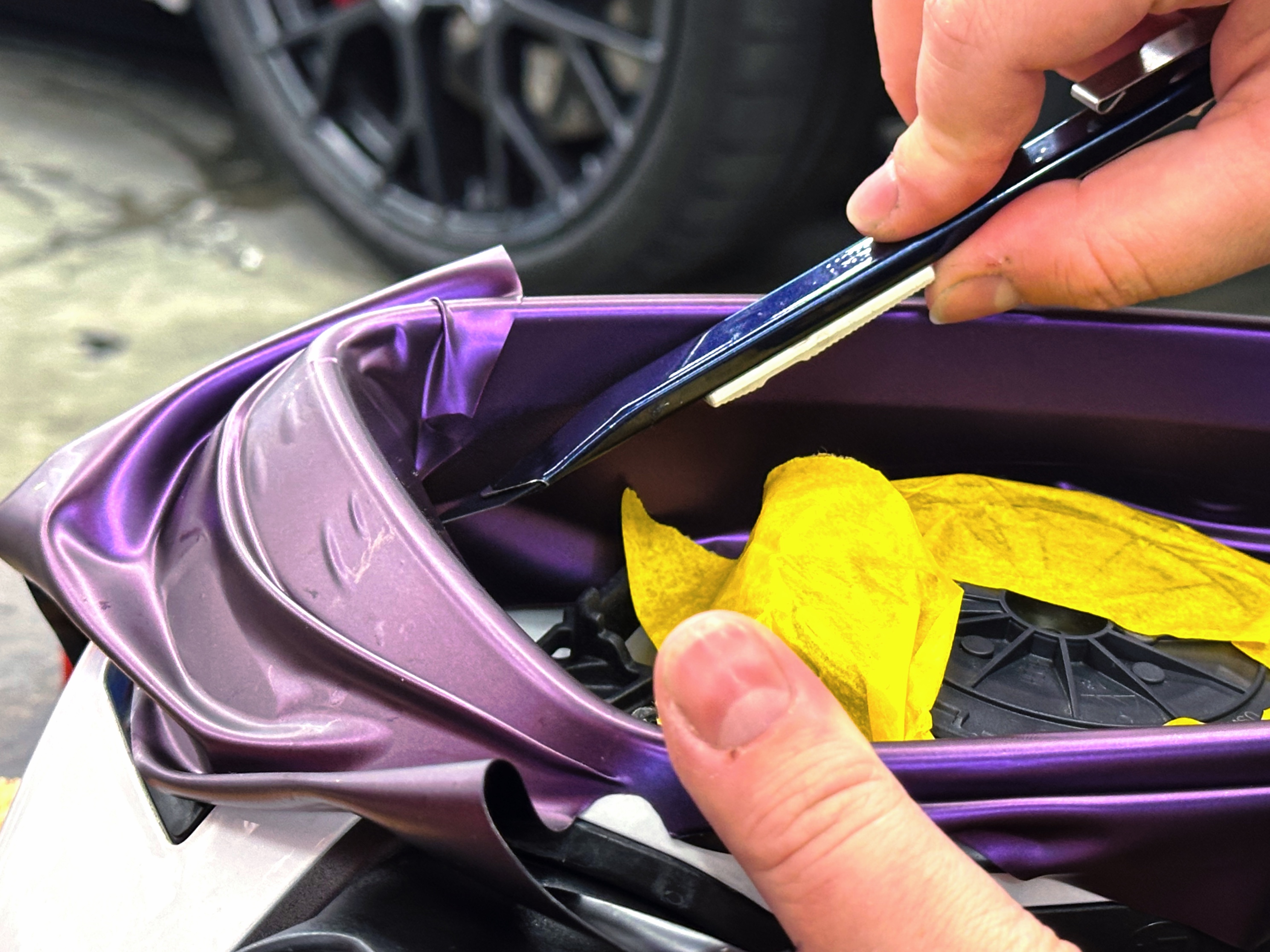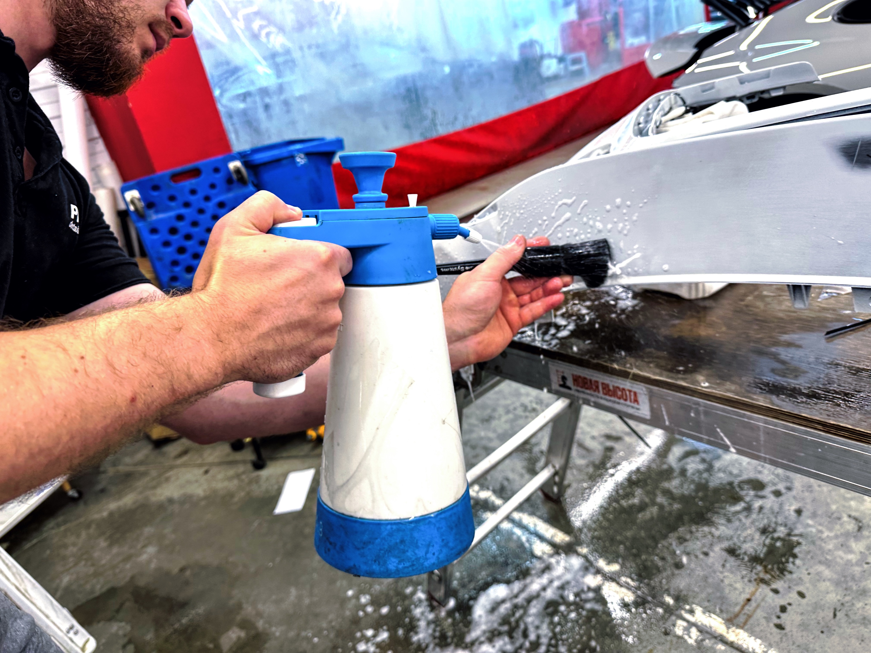Первым делом была детейлинг-мойка, при оклейке это неотъемлемый этап работ, так как иначе пленка не будет держаться на кузове из-за мелких песчинок и пылинок. Далее мы приступили к разборке автомобиля и к восстановлению покрытия и некоторых элементов (PDR, выравнивание кузова, локальный покрас).