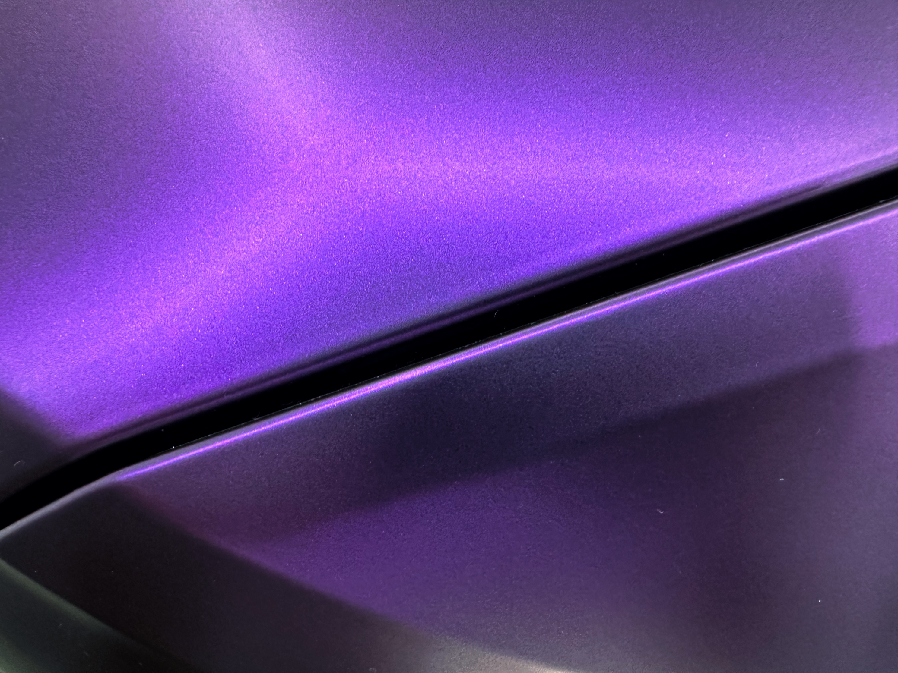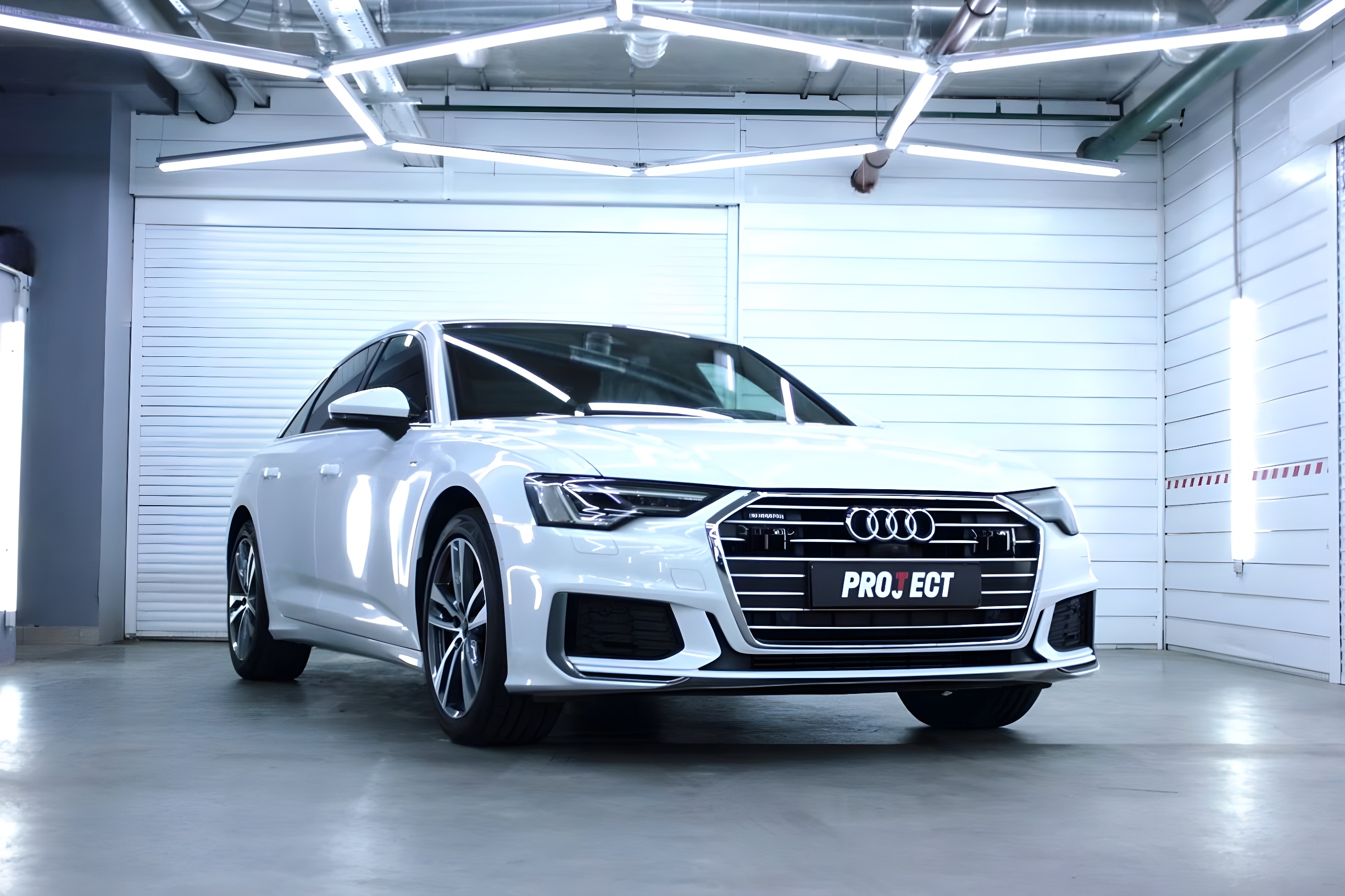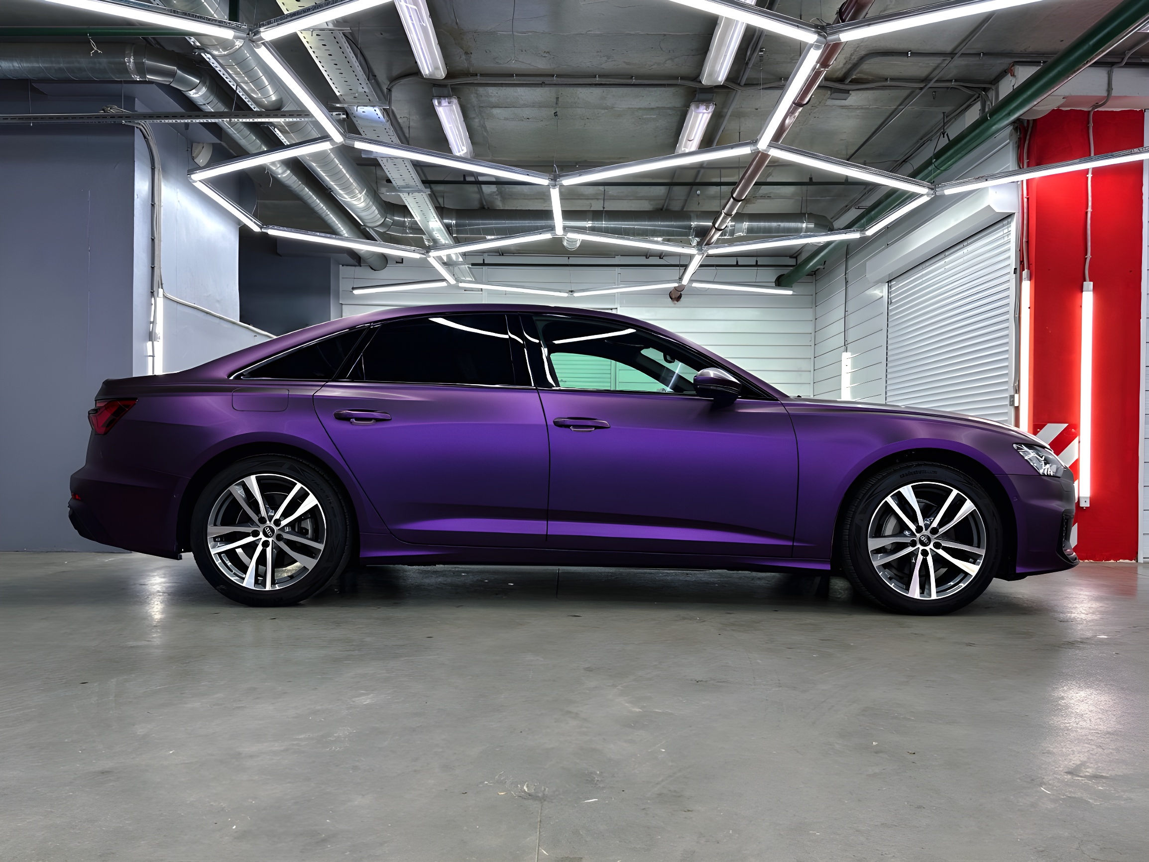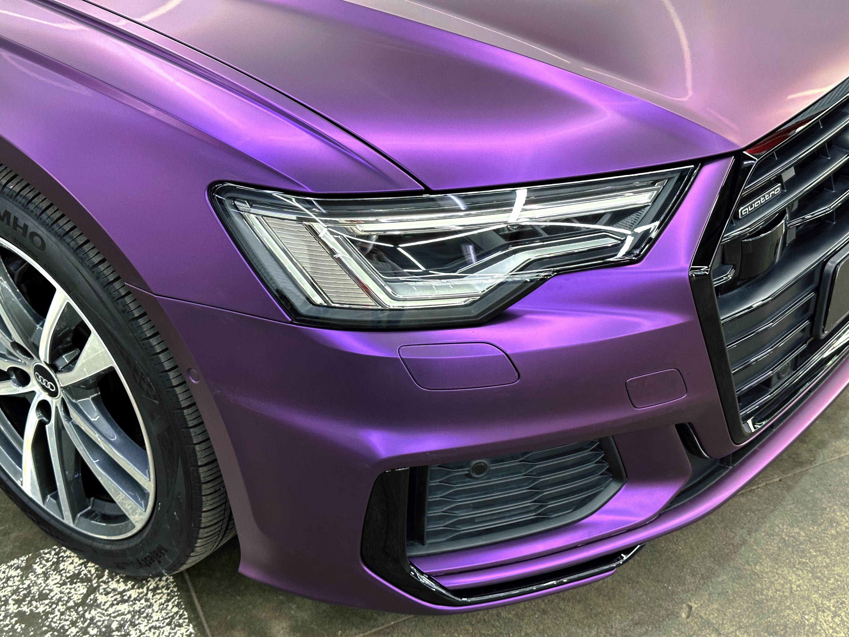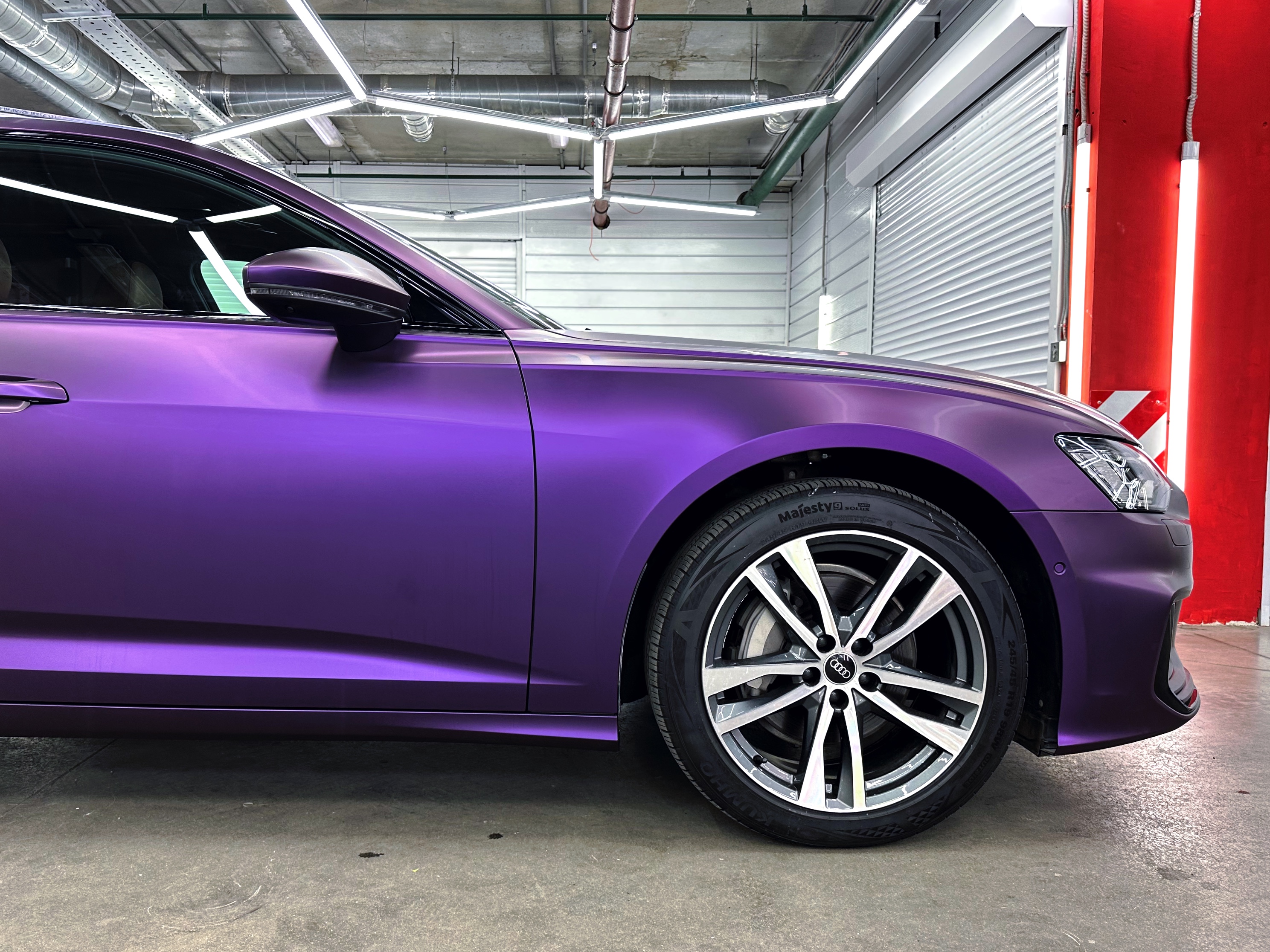 К нам заехала Audi A6 в белом цвете с необычным запросом на преображение: переклейка в сатиновую фиолетовую пленку.